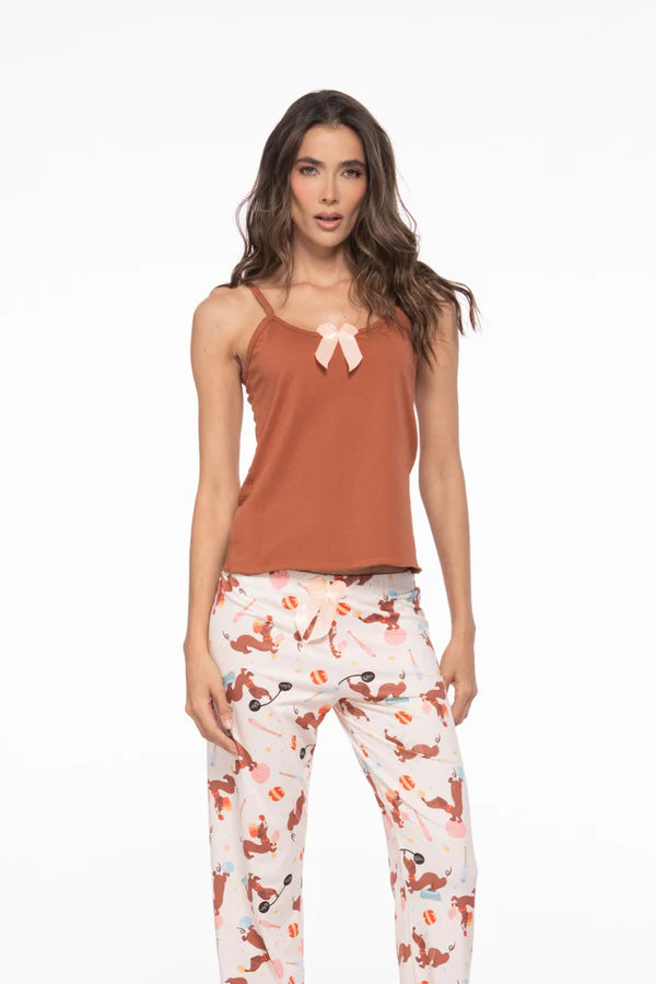 El pantalón cuenta con un estampado fresco y divertido de perros, que le da un toque femenino, mientras que la camiseta neutra equilibra el look con un aire minimalista y versátil.